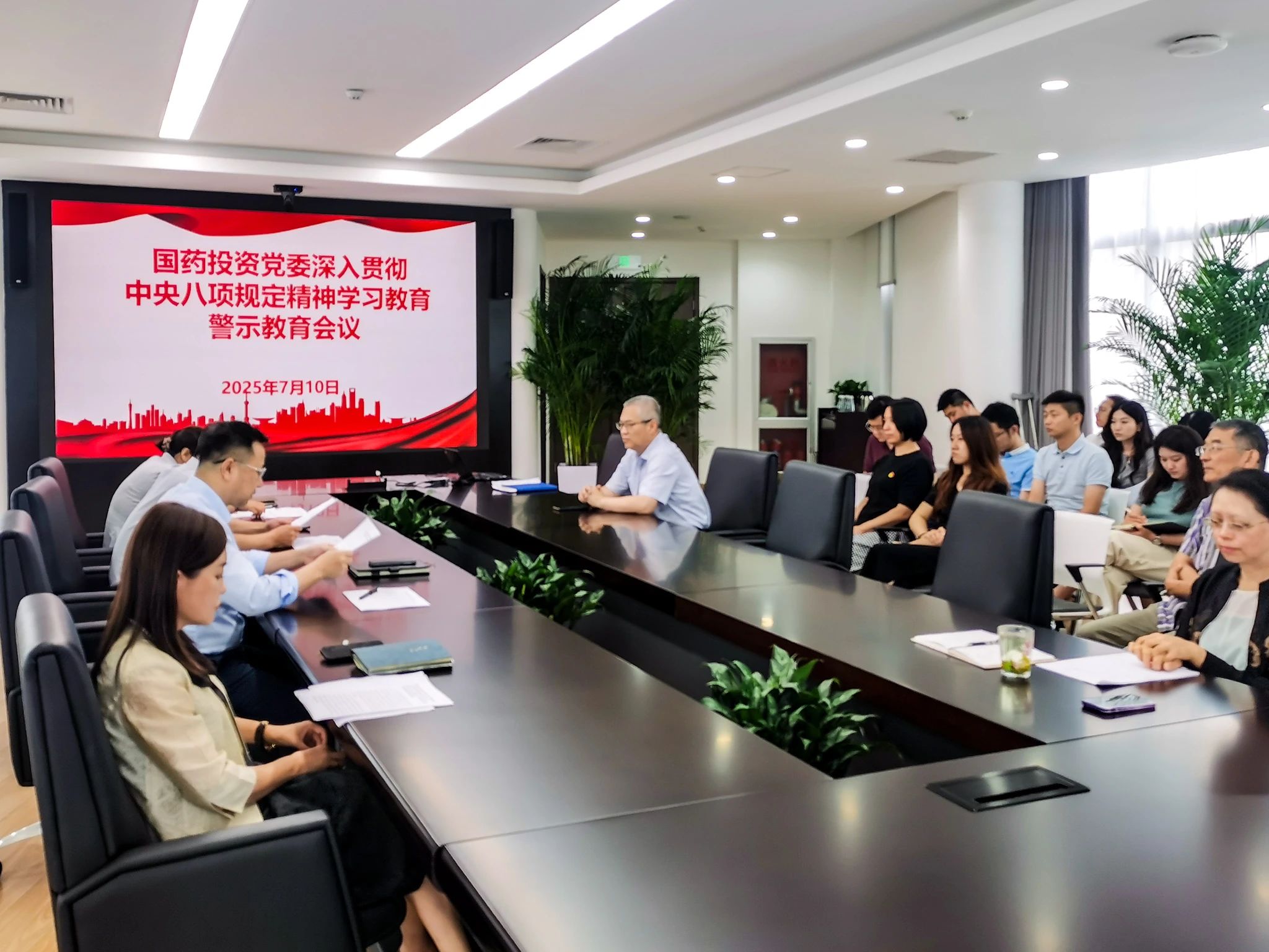 7 月 10 日,国药投资党委召开深入贯彻中央八项规定精神学习教育警示教育会,深入学习贯彻习近平总书记关于加强党的作风建设的重要论述,传达学习国资委党委、国药集团党委警示教育会精神,集中观看集团警示教育片,进一步强化纪律意识,深化警示教育成效。公司党委书记、董事长英军作总结讲话,党委副书记、总经理王永利主持会议。
