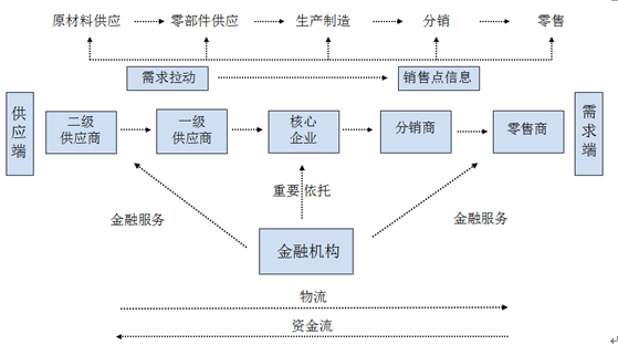 产业链是指贯通从产品设计到原材料和零部件供应、生产制造、分销、零售等过程,由核心制造企业、供应商、分销商、零售商等组成的网络。产业链金融是指以核心企业为依托,以真实贸易背景为前提,运用自偿性贸易融资的方式,通过对产业链上相关企业的信息流、资金流、物流的控制,降低资金风险,对产业链上下游企业提供的综合性金融产品和服务。
